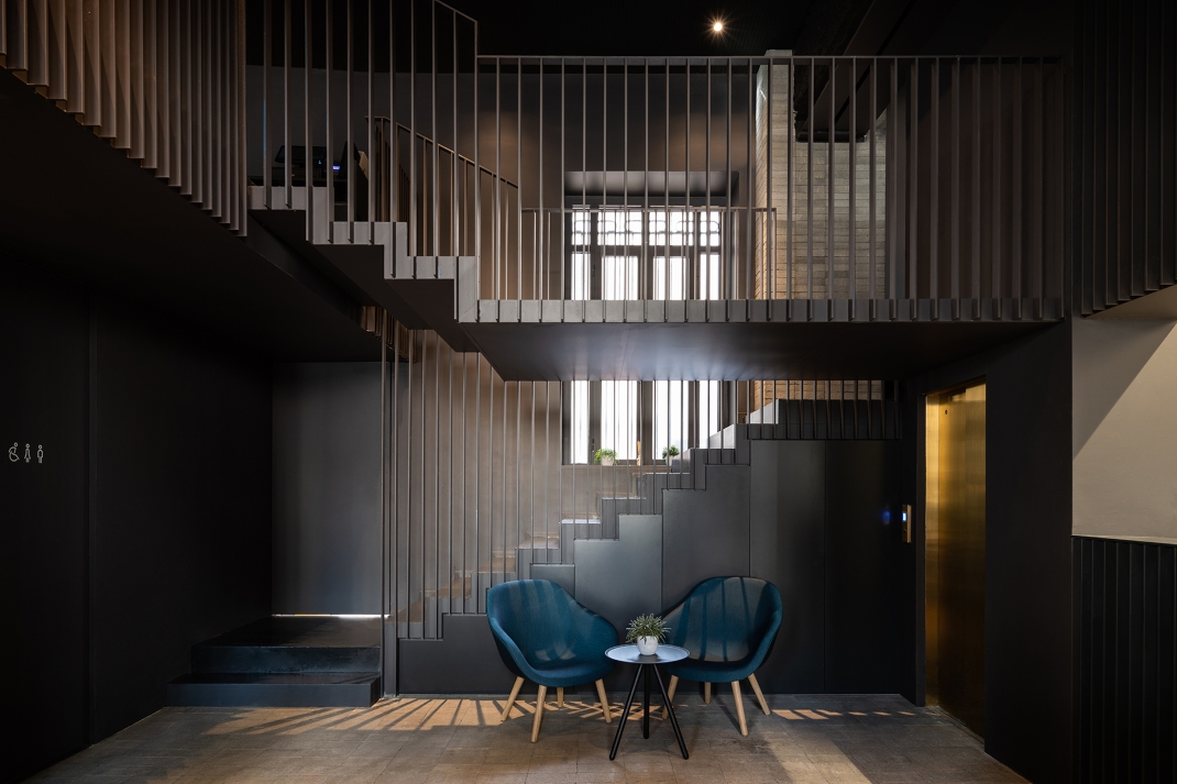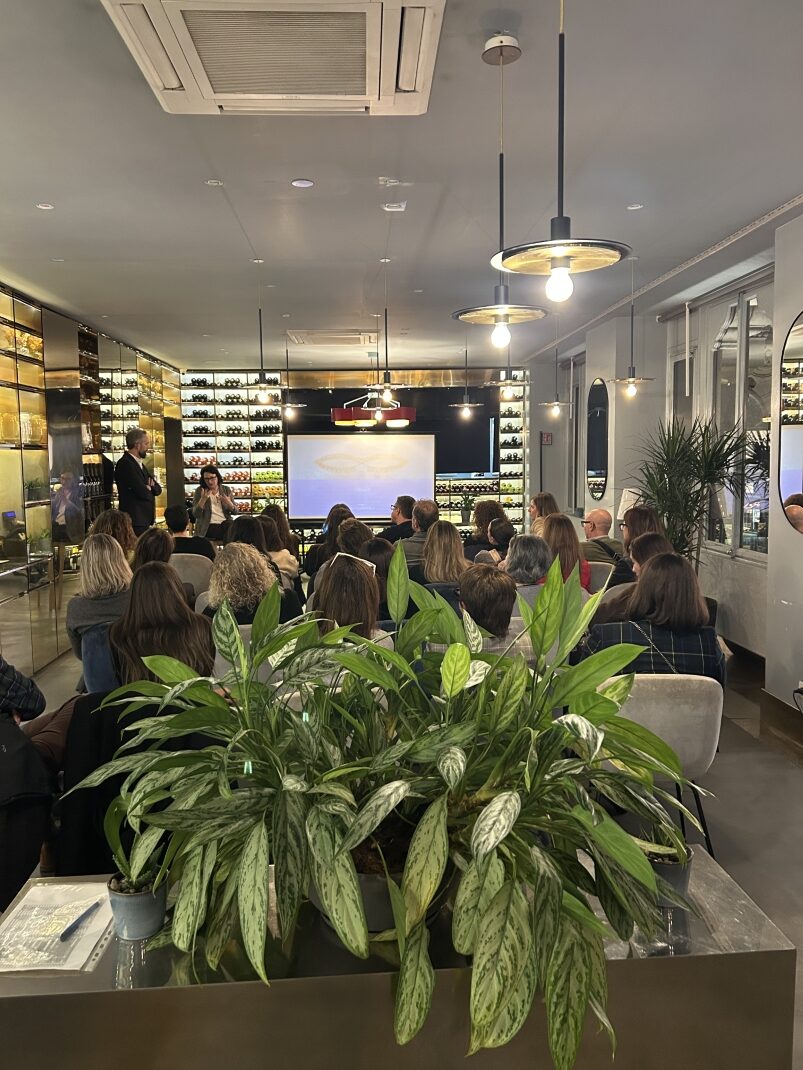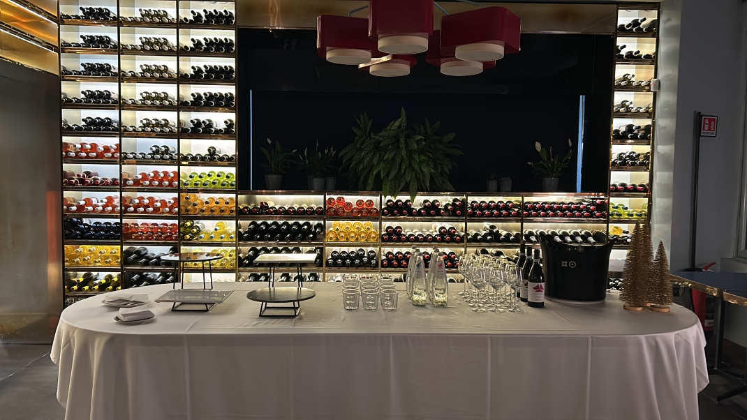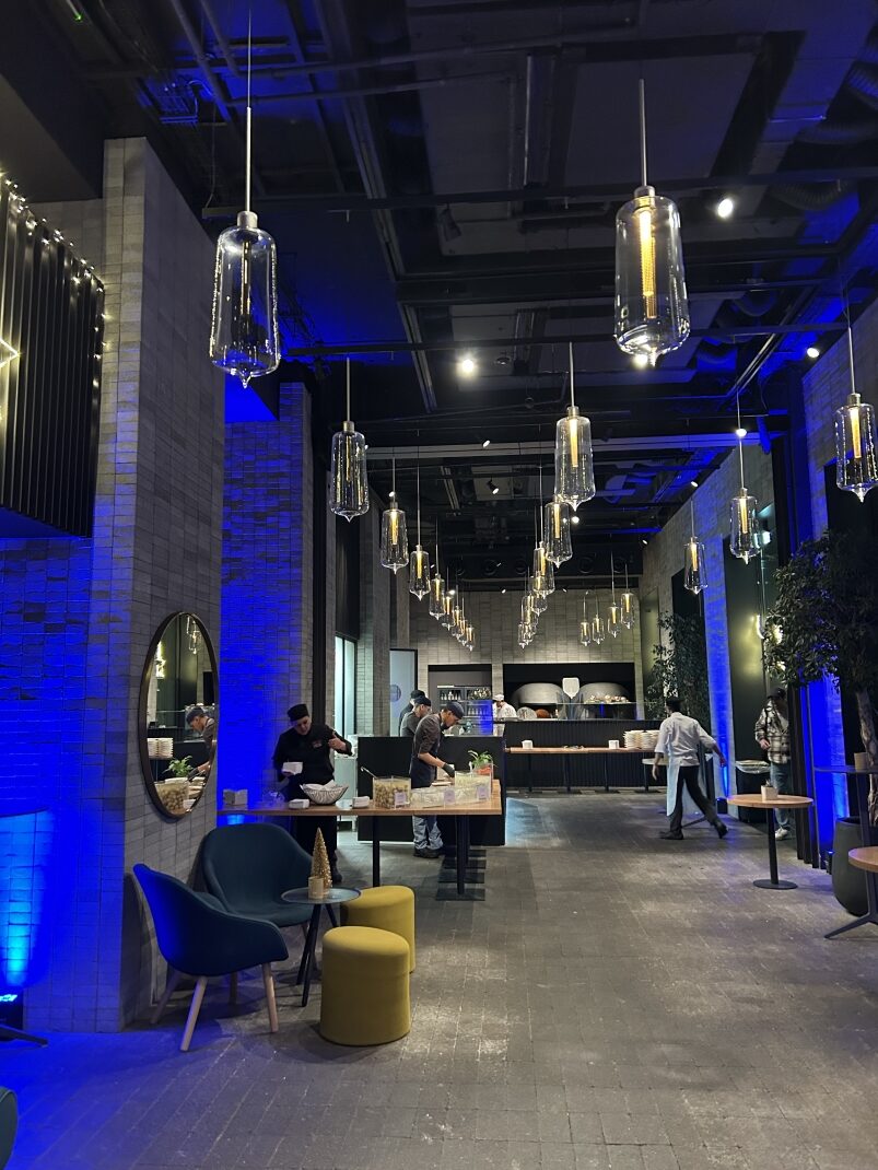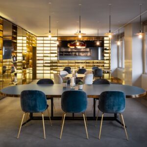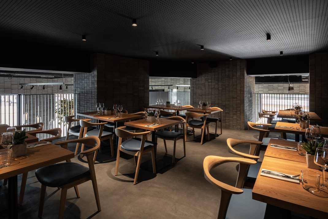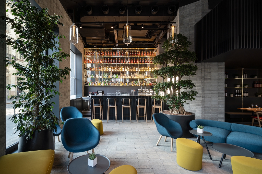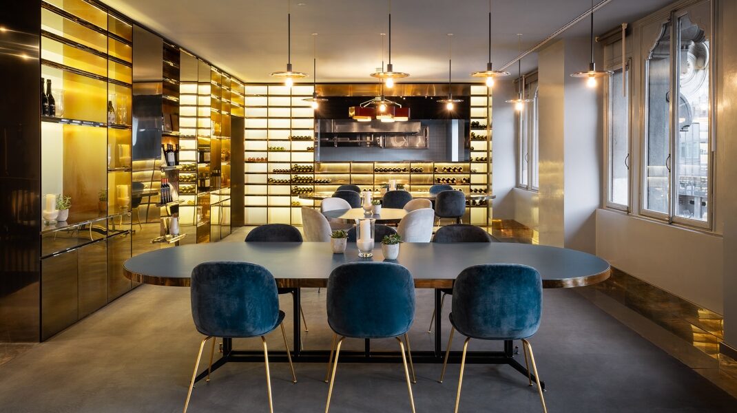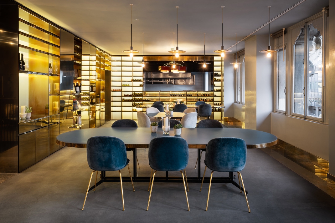 The restaurant comprises a main dining room with a terrace and mezzanine, and a meeting room. The main dining room on the ground floor features high ceilings and large windows overlooking the intersection of Via Cusani and Via Broletto in Milan. Upon entry, guests are welcomed by a lounge bar area with sofas and armchairs. The rest of the dining room, with an open-plan mozzarella bar and pizzeria, is furnished with tables and chairs that can be easily removed for formal events.