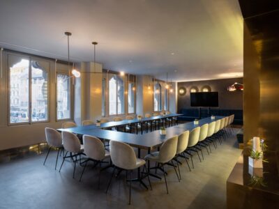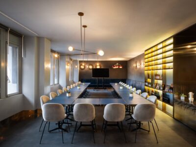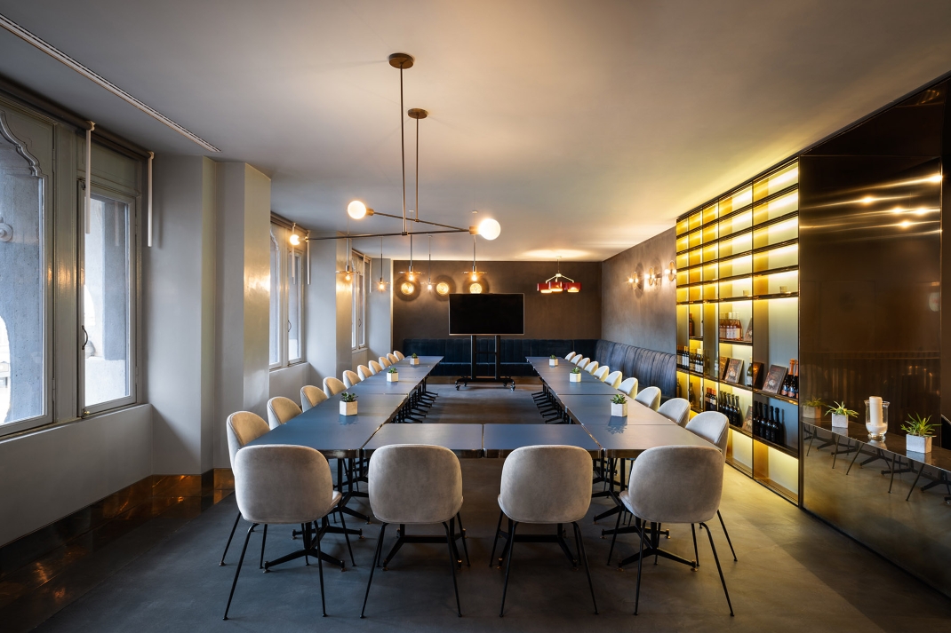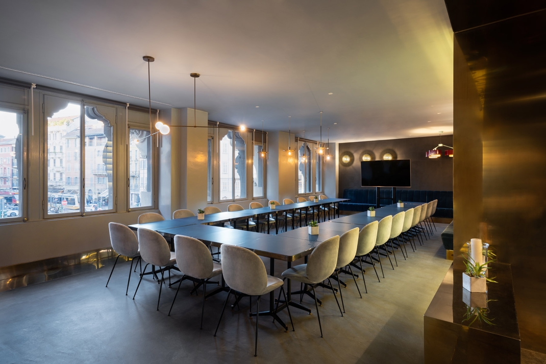 The meeting room is located on the first floor, accessible by both stairs and elevator, and is equipped with a dedicated kitchen. The tables and chairs in the room can be arranged according to the client's needs, from meetings to seated dinners.