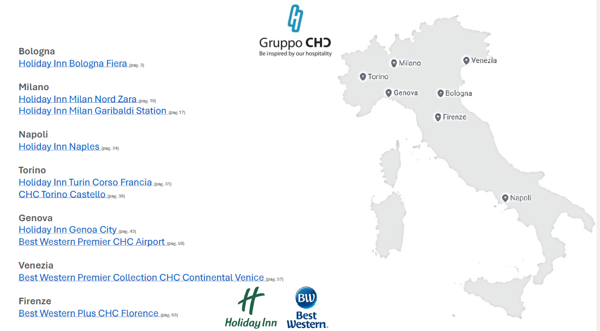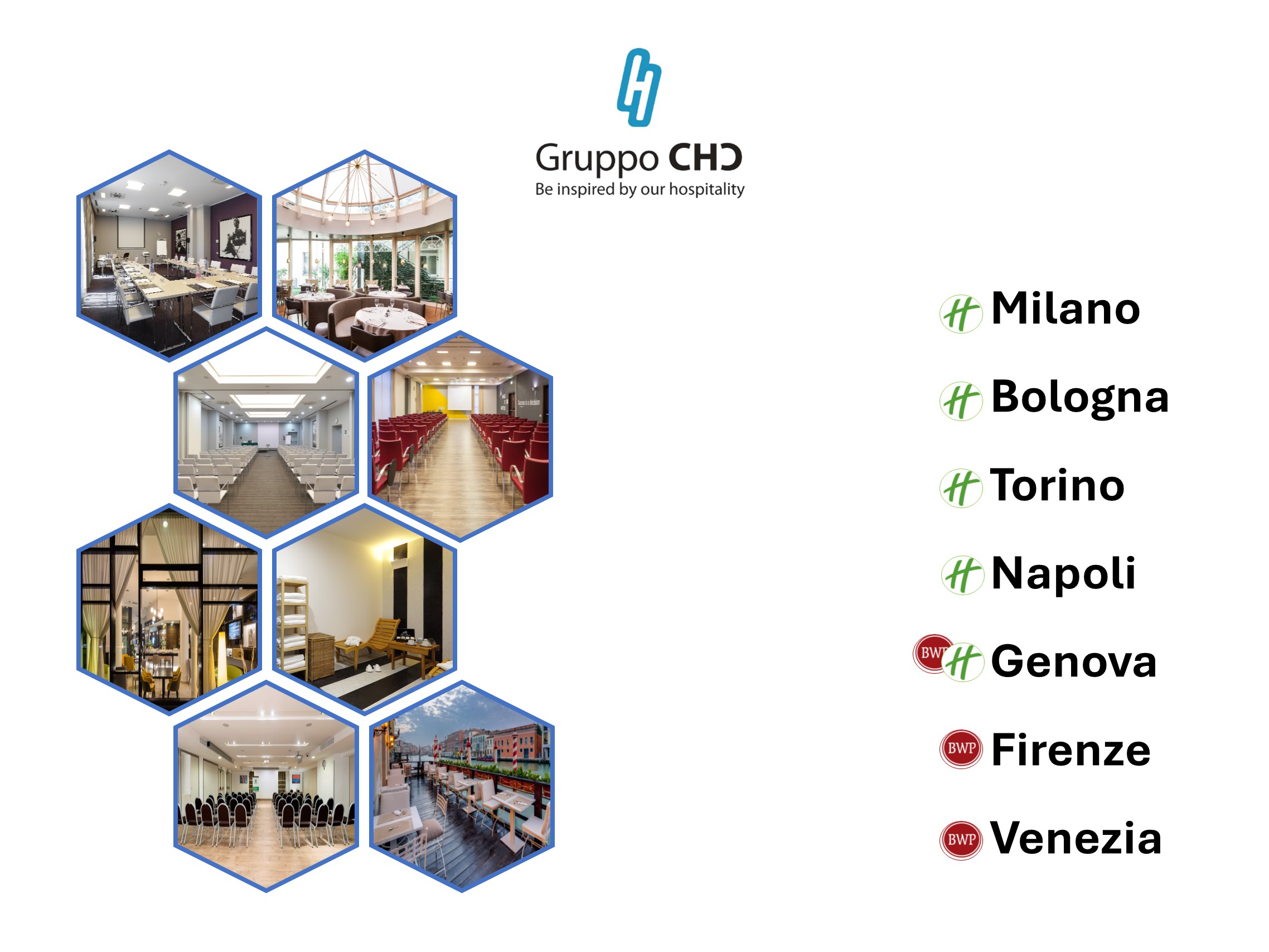 Con oltre 20 anni di esperienza nel settore alberghiero, il Gruppo CHC è proprietario e gestore di alberghi 4 stelle, affiliati ai prestigiosi brand internazionali IHG Hotels & Best Western, che garantiscono un alto livello di qualità del prodotto e dei servizi nelle principali città italiane quali Milano, Torino, Bologna, Genova e Napoli – offrendo un totale di 38 sale meeting e 1369 camere.