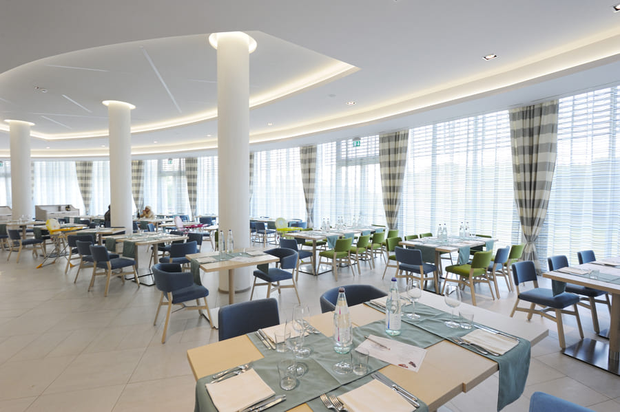 L’Hotel a quattro stelle e la sala congressi, ristrutturati nel 2016, offrono un ambiente moderno ed elegante. È dotato di un ampio ristorante, dove organizzare cene speciali, e di un giardino interno adiacente alla sala congressi, per coffee break estivi o pause rigeneranti.
