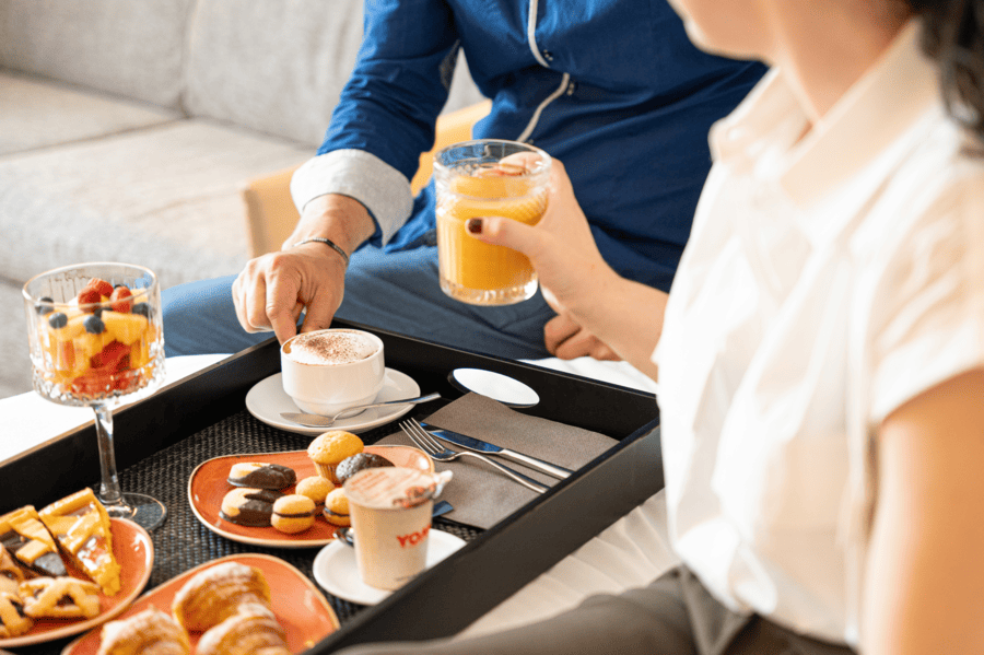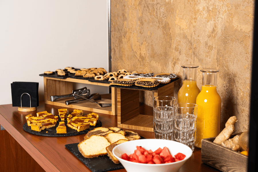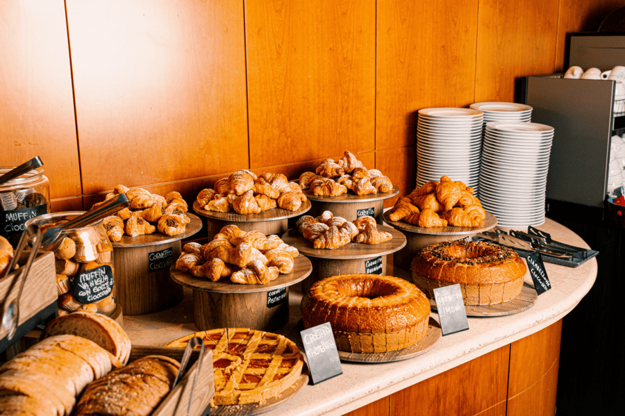 La colazione offre diverse opzioni, dal ricco buffet americano al caffè veloce al bar, fino alla comodità del servizio in camera. Su richiesta sono disponibili anche prodotti biologici e senza glutine.