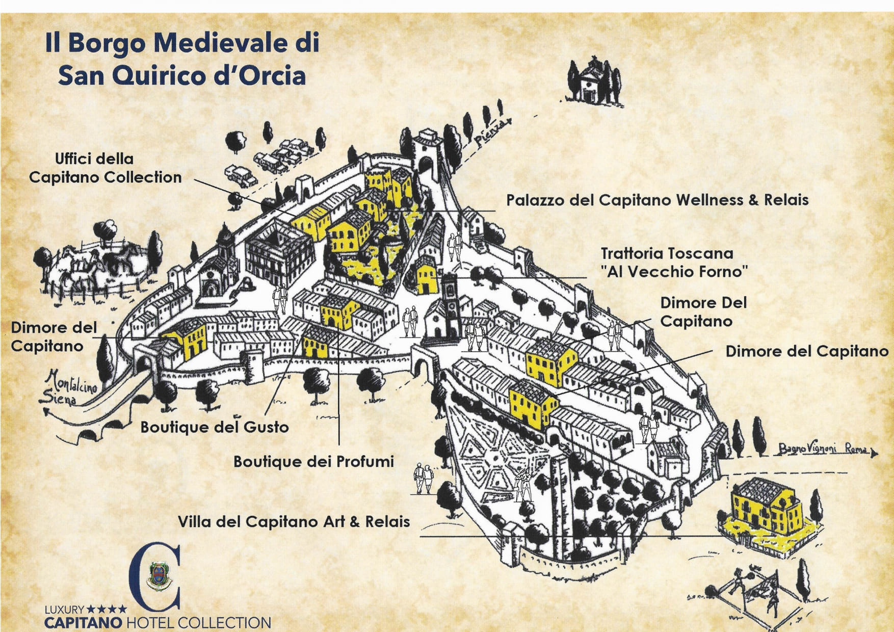 Resort diffuso realizzato all'intero dell'autentico Borgo Medievale San Quirico d'Orcia, cuore della Val d'Orcia - Patrimonio Unesco: immerso tra i vigneti del Brunello di Montalcino Montalcino, dei Nobile di Montepulciano e le strade di cipressi più famose al mondo. Resort Capitano Collection - Borgo Medievale San Quirico d'Orcia è progetto nato del 1995 per valorizzare il borgo, le sue architetture e gli artigiani locali: 55 camere realizzate in prestigiosi palazzi del centro storico, una Trattoria Toscana raccomandata dalla Guida Michelin, Bar, Privat SPA e centro massaggi, shops enogastronomici e cosmetica artigianale, noleggio bici e rimess, cantine storica e tante attività, esperienze esclusive di caccia al tartugo, tour in famose cantine di vino del territorio, pastifici e caseifici locali organizzate dal nostro servizio concierge.